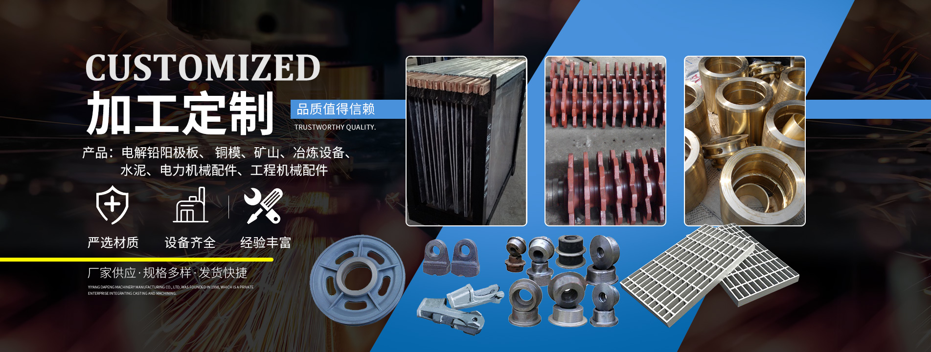 主要產(chǎn)品有:電解鉛陽(yáng)極板、 銅模、礦山、冶煉設(shè)備、水泥、電力機(jī)械配件、工程機(jī)械配件